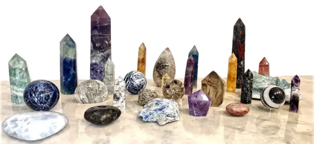 Elegant HerMJ gemstone jewelry display showcasing an array of beautifully cut and polished natural gemstones, including amethyst, lapis lazuli, rose quartz, and obsidian, emphasizing healthy home decor and stylish accessories.