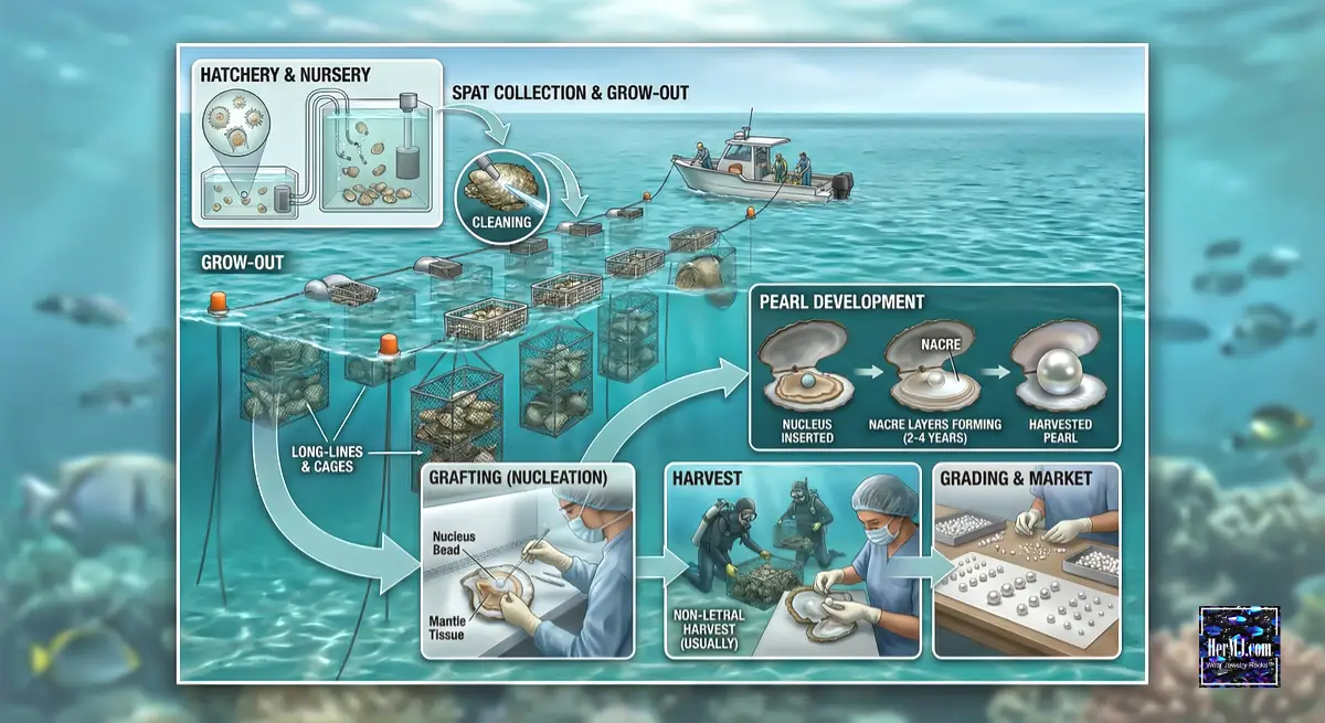 South Sea pearls are cultivated using a specific type of oyster known as the silver-lipped or gold-lipped oyster. This process can take several years, contributing to their high value. In contrast to freshwater pearls, which are routinely sourced from mussels in maintained farms, and arguably have a lesser burden on natural ecosystems than the saltwater harvested variety.