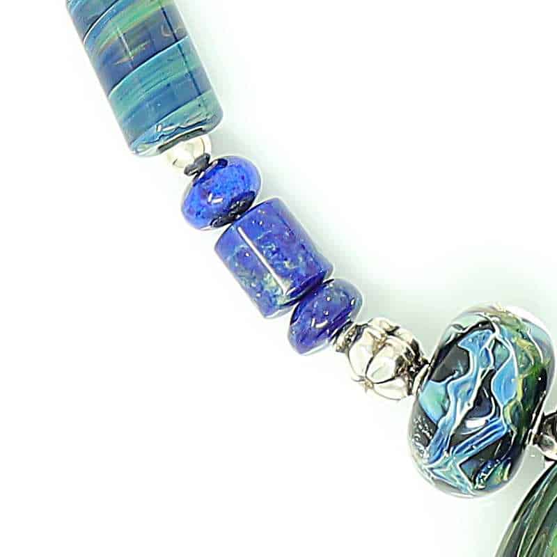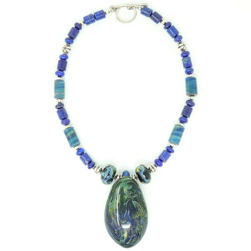 The Lapis Lazuli Sterling Silver Pendant Necklace is as unique as it is dazzling. The exquisite lampwork borosilicate glass pendant is of the highest quality. With its 8.2 mm lapis lazuli tube gemstones and lampwork borosilicate glass beads, this statement necklace is perfectly balanced with 9 mm pewter beads and 5 mm sterling silver spacer beads. Bold and beautiful, the necklace’s marriage of complementary elements comes together to create a truly unique look.