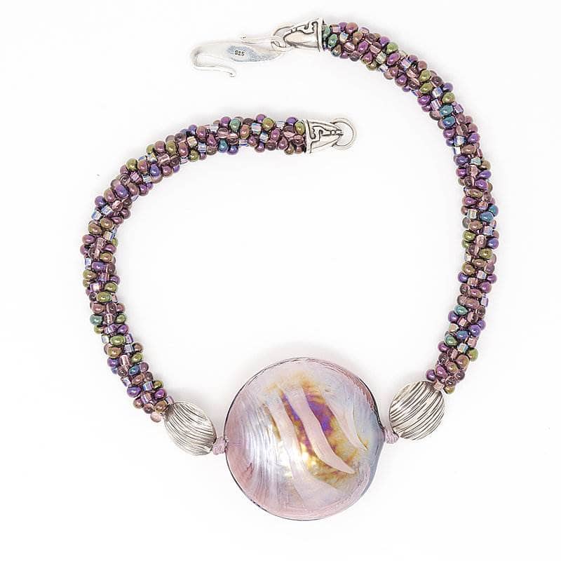 The necklace includes large beads of sterling silver enhancing the design of the necklace. The necklace is also handmade and intricately woven with purple beads and finished with handsome sterling silver end caps, complete with a stylish sterling silver hook.