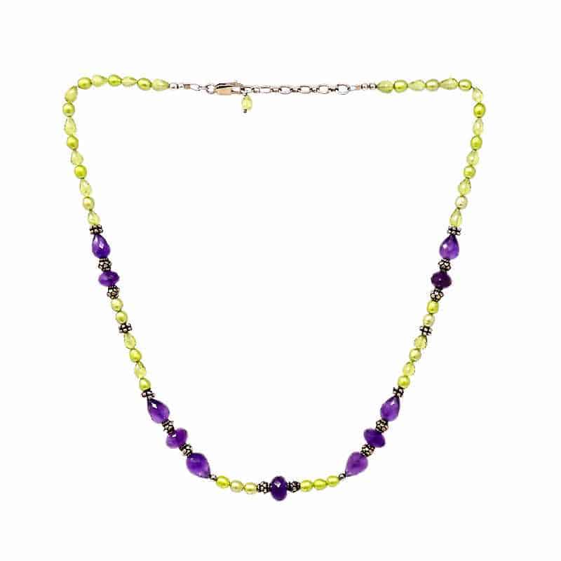 Discover the richness and beauty of the Peridot and Amethyst Necklace. The peridot and amethyst gemstones in this necklace are absolutely radiant. The Peridot and Amethyst Necklace feature opulent green freshwater pearls, pewter, and sterling silver spacer beads. The gorgeous faceted amethyst gemstones range from 7 mm to 12 mm, along with 5 mm faceted peridot gemstones. This necklace is a glamorous show-stopper.
