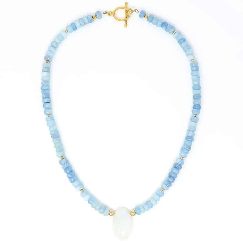 Rainbow Moonstone Aquamarine Gold Pendant Necklace