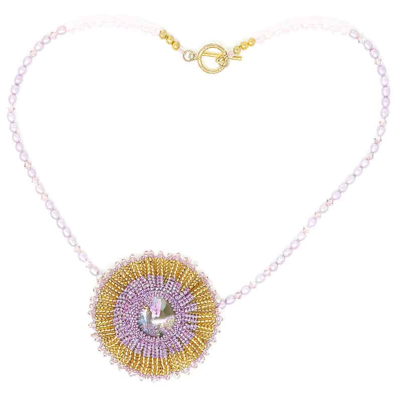 The intricately woven beaded petals are jeweled in lavender and gold, and adorned with Swarovski® crystals. The unique pendant measures an amazing 2.5 inches wide. Freshwater pearls and crystals complete this designer work of art.