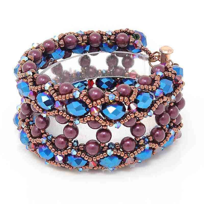The audacious Versailles Bracelet features gorgeous 6 mm faux pearls and large 9 mm blue faceted crystals. The bracelet is a wonderful fashion-forward design in delicious plum and striking blue.