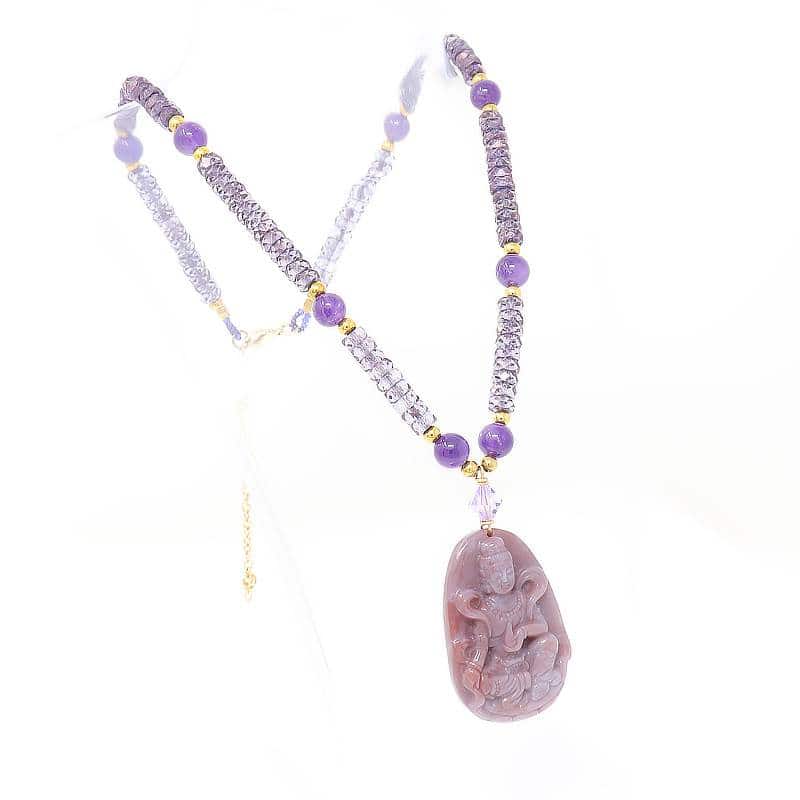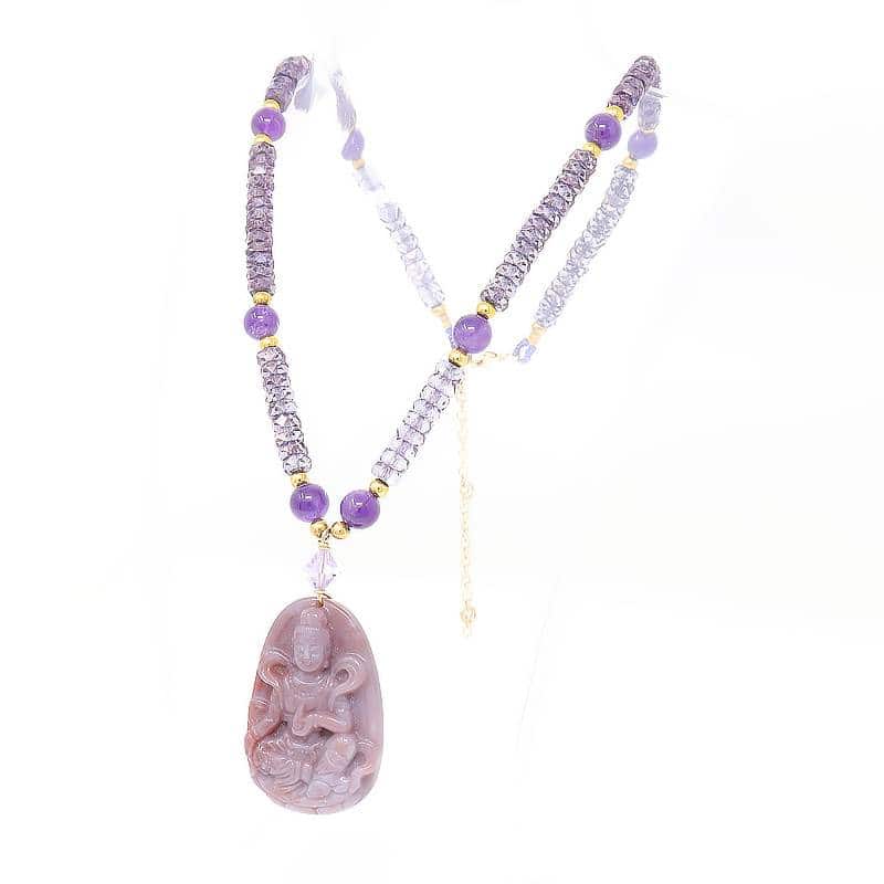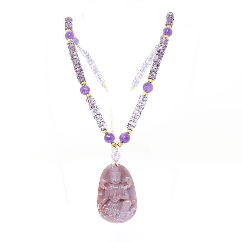 The carved agate Buddha pendant is the feature of the necklace, suspended on a beautiful lavender crystal.Ā The necklace makes a unique statement and has a feeling of tranquility, with a 2-inch gold-filled extender.