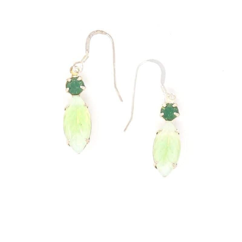 The beautiful Aurora Earrings are lightweight with a striking vintage etched glass leaf finished with a vintage green matte crystal.Ā The reflection from the leaf has an opal-like essence. A silver-tone backing adds to the beauty of the earring which is completed by a sterling silver earring wire.Ā The stones are handset.