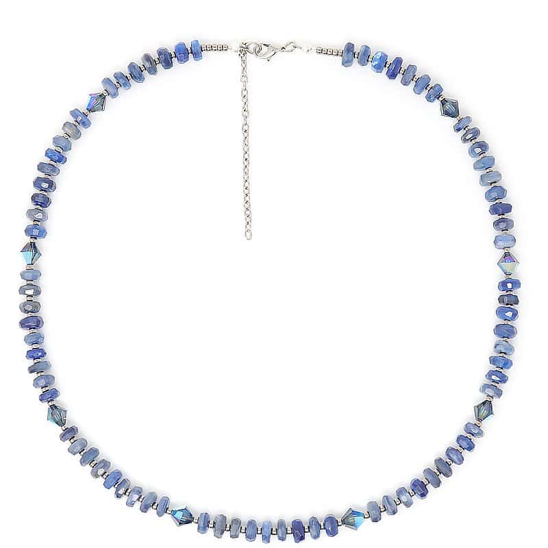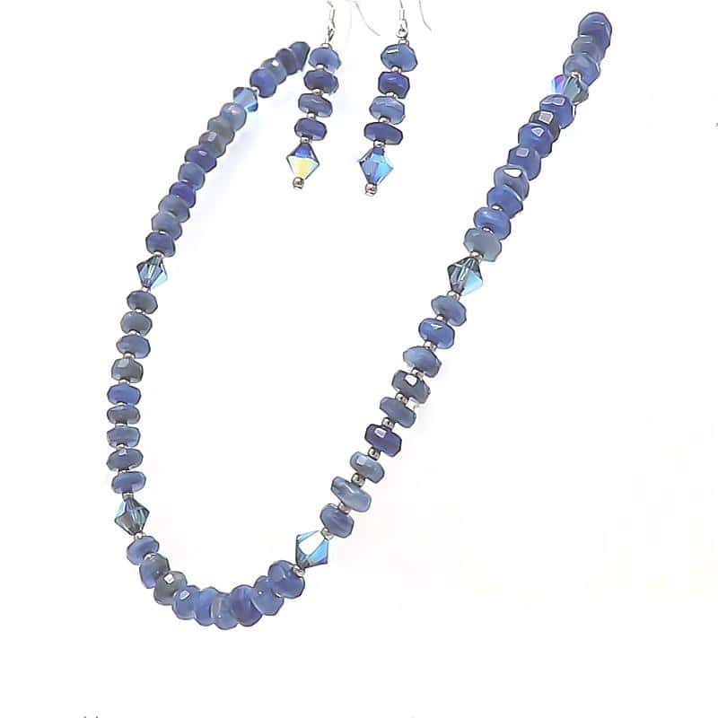 The Blue Kyanite Gemstone Necklace and Earring Set is quite a treasure to behold.Ā Own a rare beauty displaying 8 mm faceted gemstones. The necklace includes 8 mm imported high-quality European Montana blue designer crystals.Ā Ā A perfect match to the necklace is the Blue Kyanite Gemstone Earrings completed with sterling silver ear wire, a lovely combination for your casual or formal outing.
