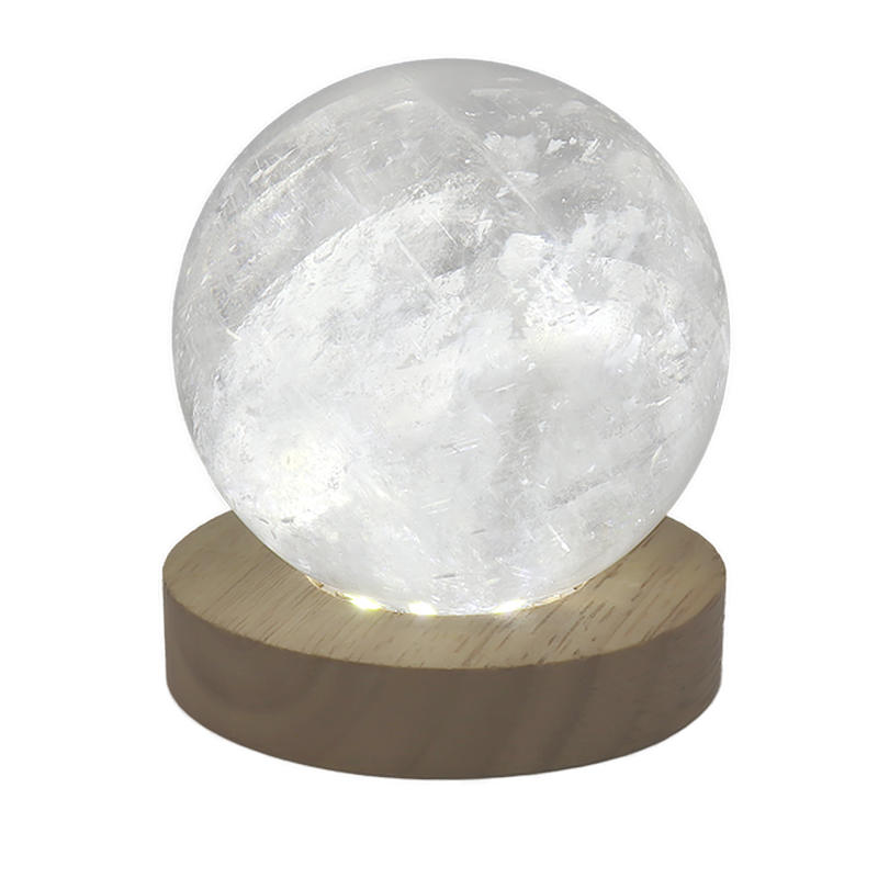 Pretty White Calcite Sphere with a beautiful inner glow. This is a natural gemstone that reflects light and is reminiscent of holding the moon in your hands. The gemstone comes with a wooden holder featuring LED lights. A perfect holder that illuminates the Calcite.